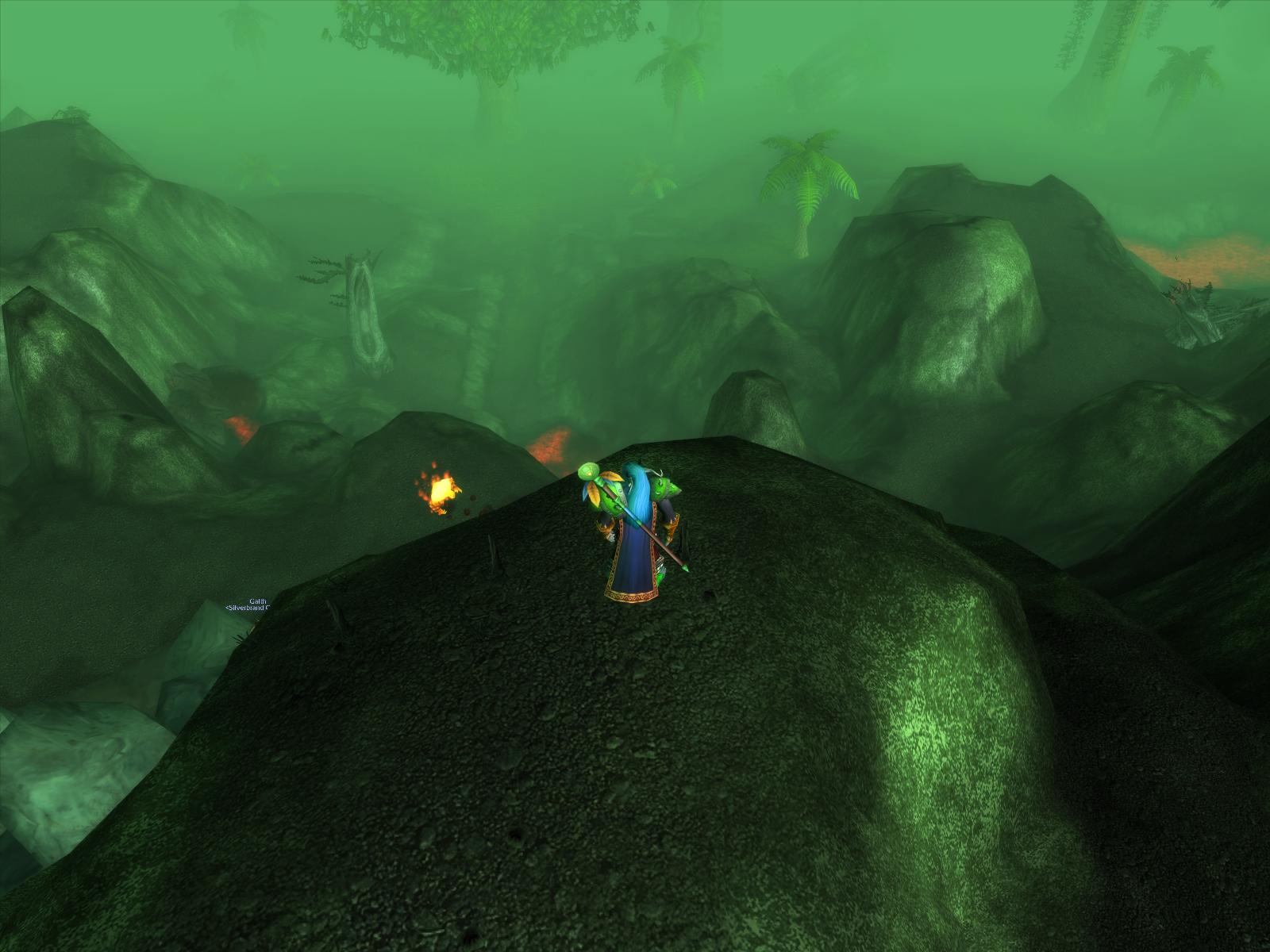 The ever-present and all-pervasive danger of Un'Goro often hides the wondrous, natural beauty of the crater's flora and fauna. Note Galth just visible at 8 o'clock from me, and Mishrack is somewhere around too. We're thinking much more of the "danger" this day as we battle the fire elementals.